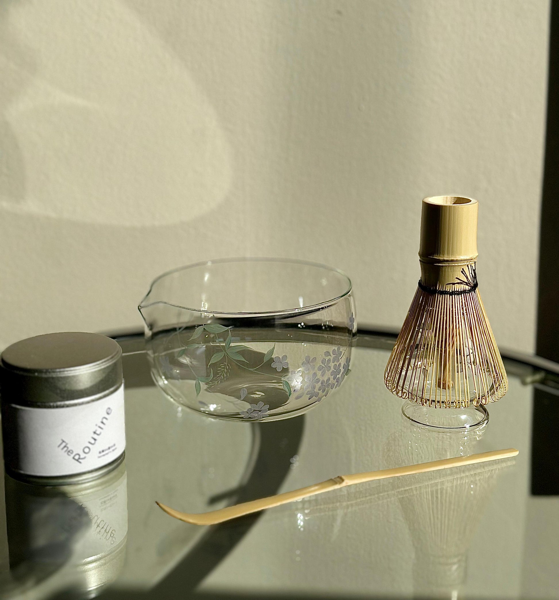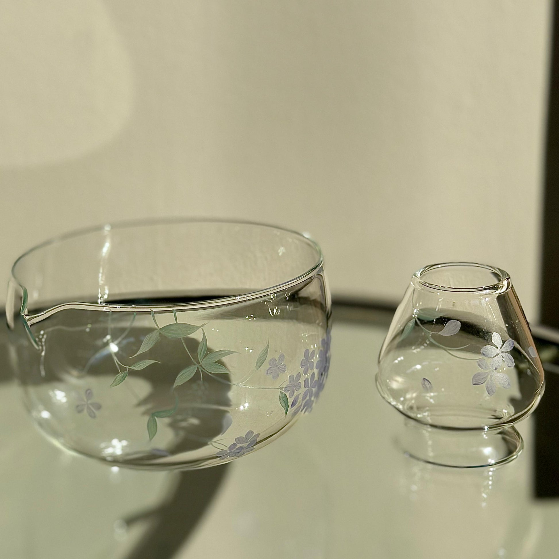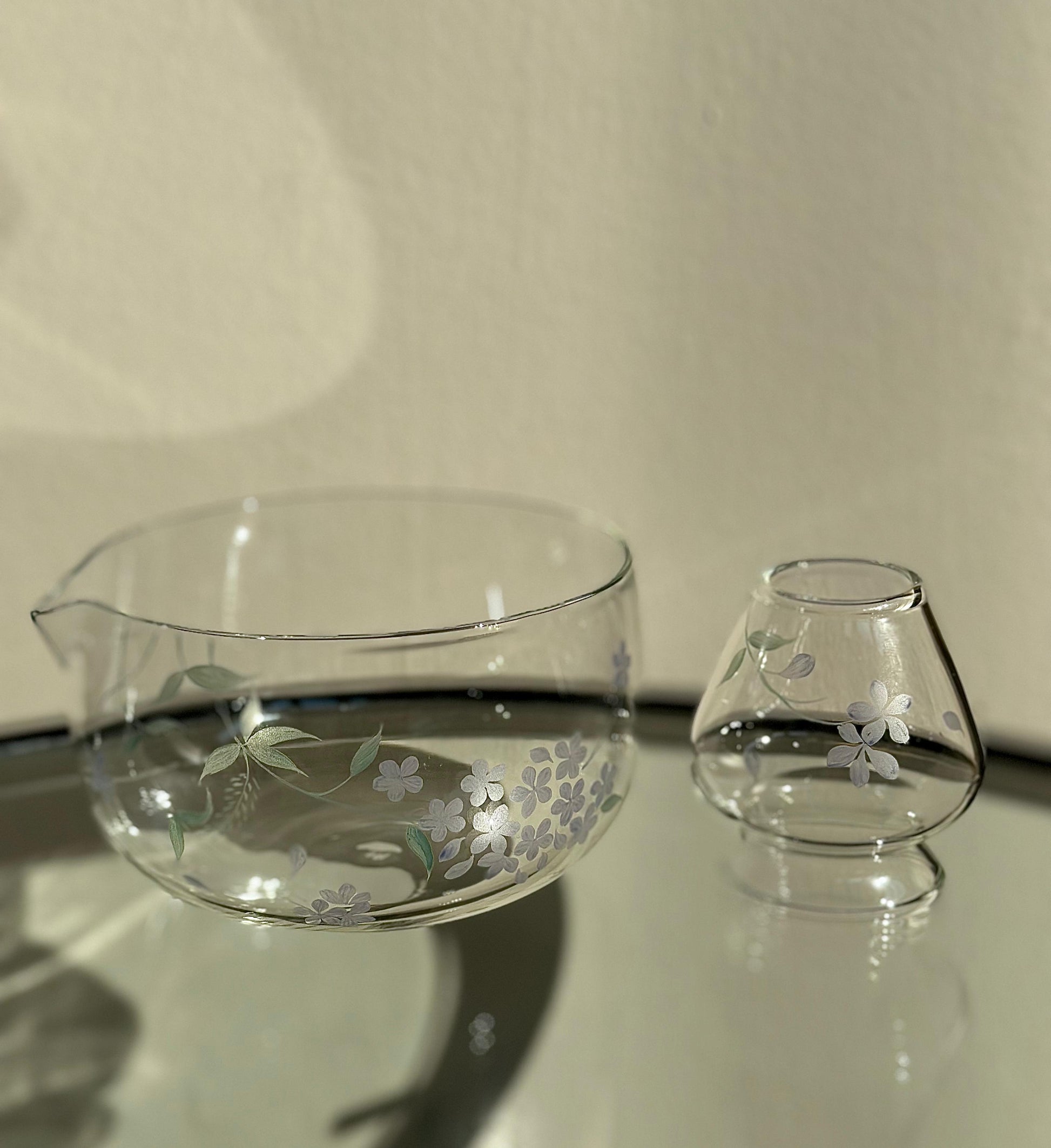A clear glass matcha kit hand painted with soft blue hydrangeas. Minimal yet detailed, this kit brings a gentle presence to your countertop.