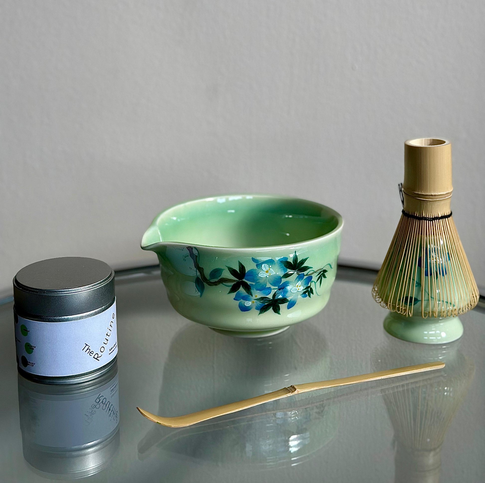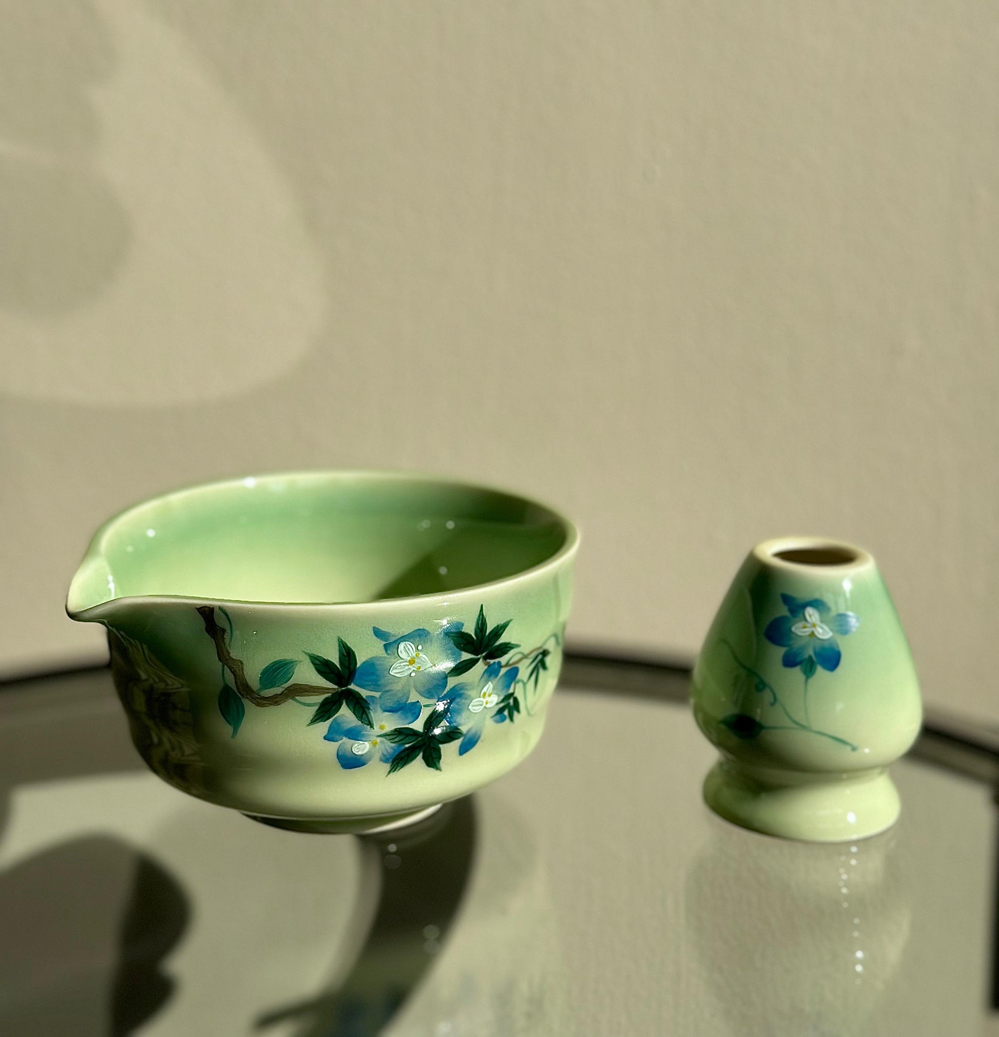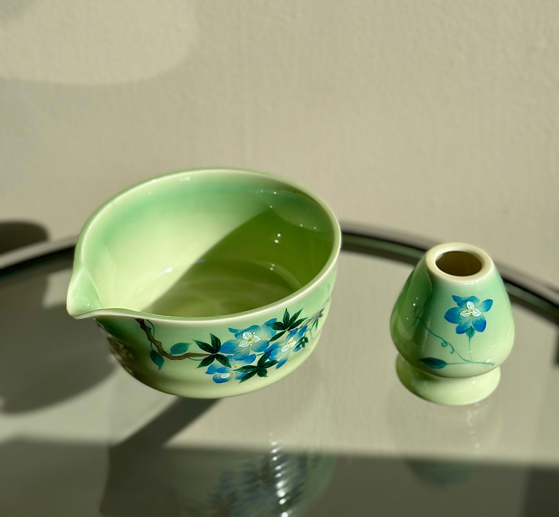 A hand-painted green ombré matcha kit featuring delicate blue morning glory flowers across the bowl and whisk holder.