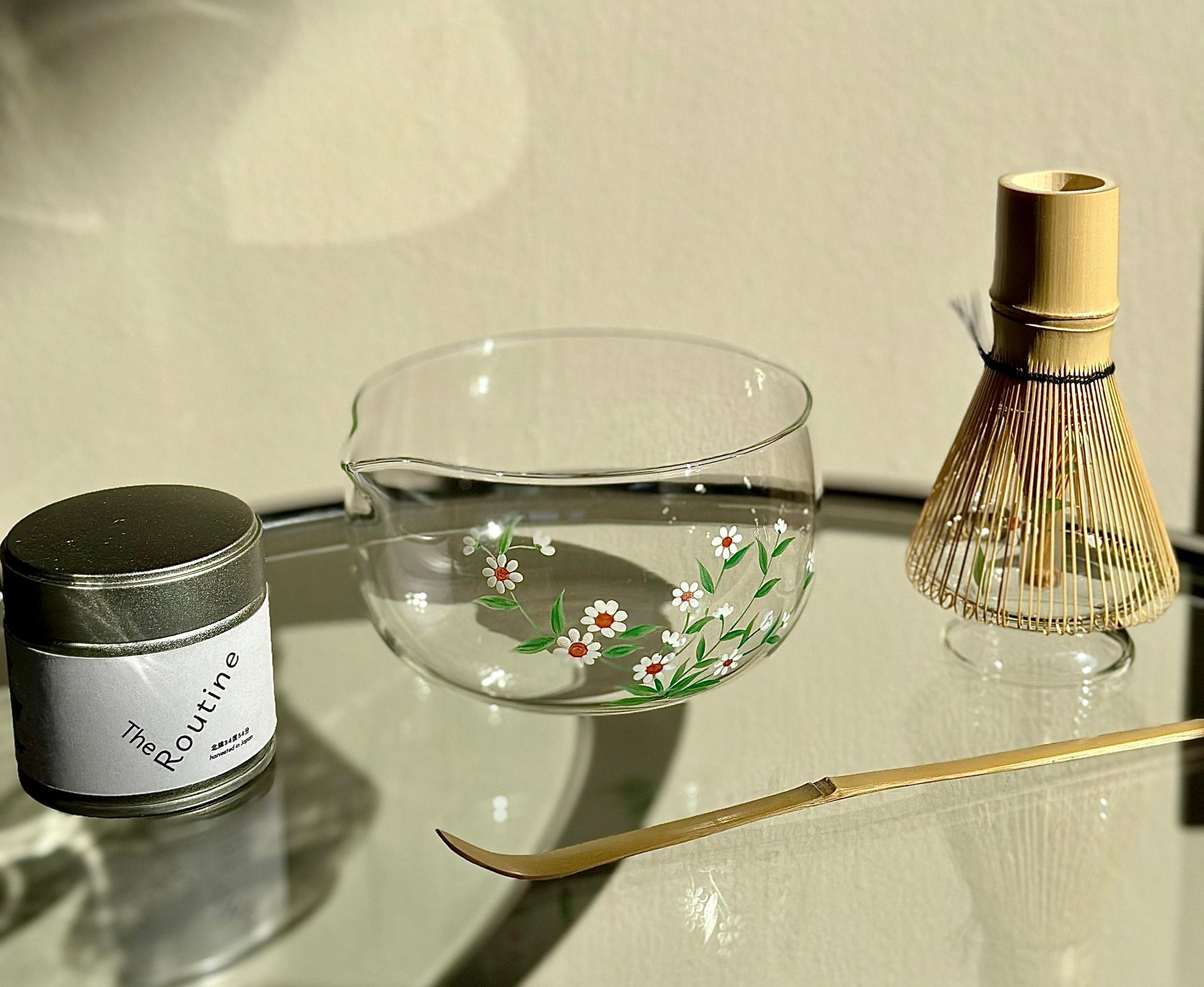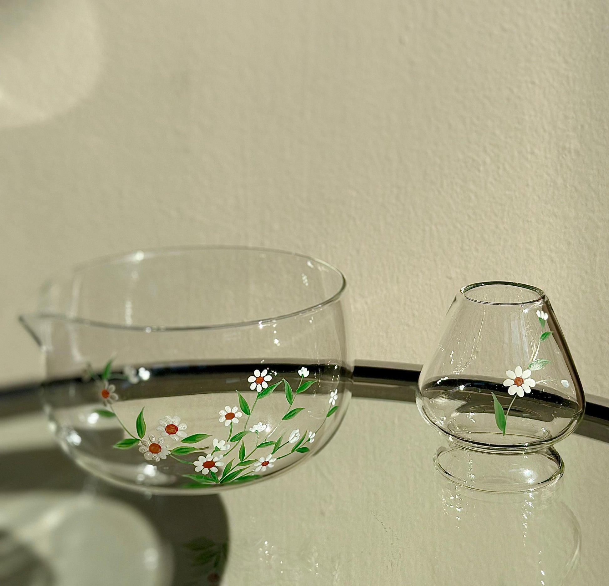 A hand-painted glass matcha kit featuring soft chamomile-inspired florals across a clear mixing bowl and matching holder.