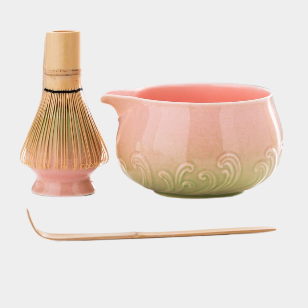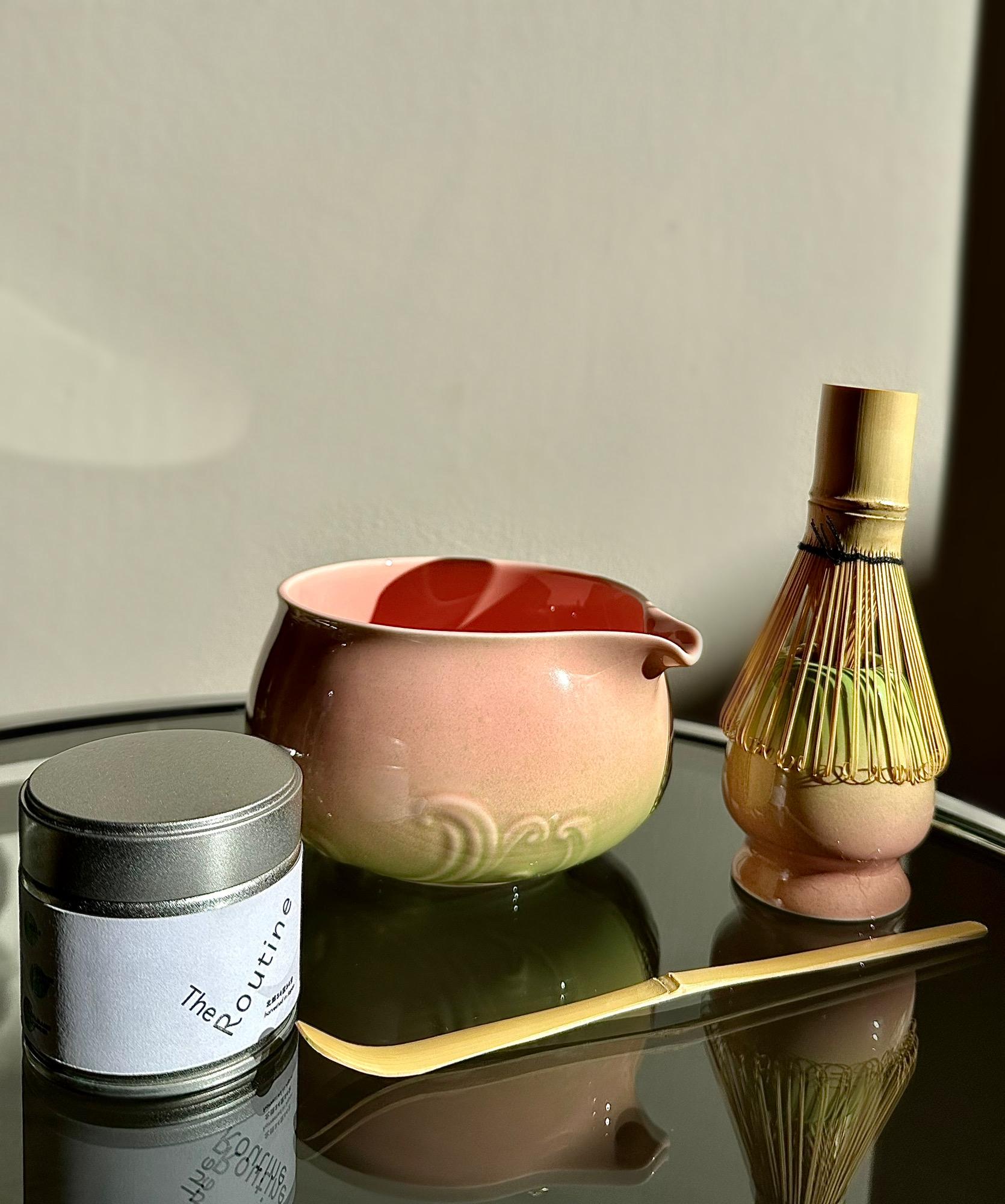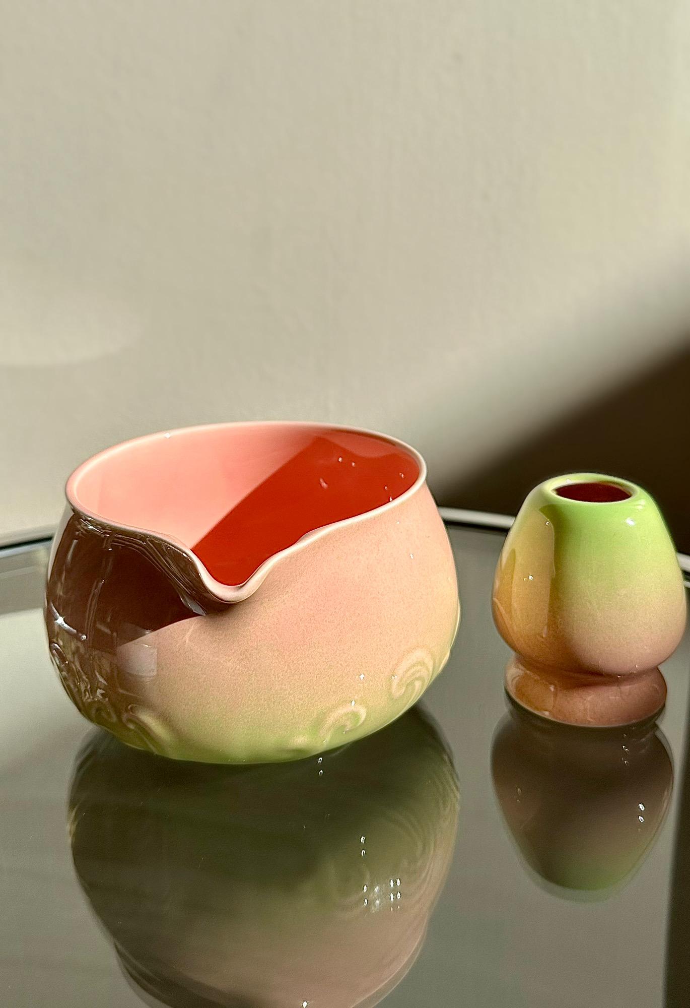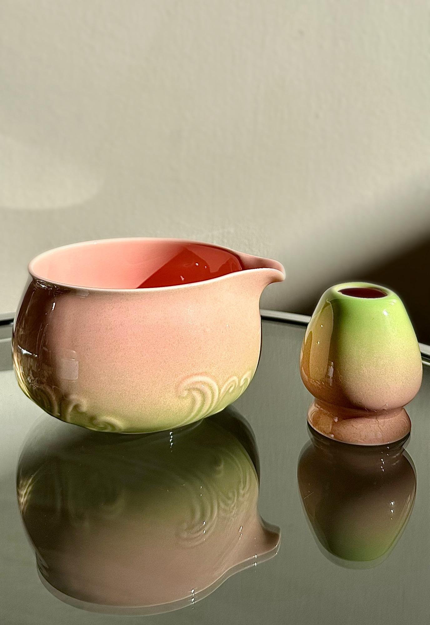 A soft ombré matcha kit of blush pink and sage green, designed to bring warmth and gentle contrast to your kitchen. This glaze pairs effortlessly with neutrals, wood tones, and pastel cookware.