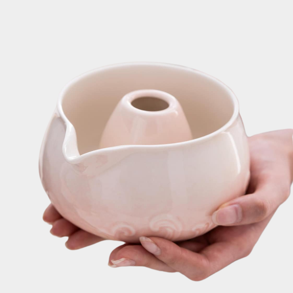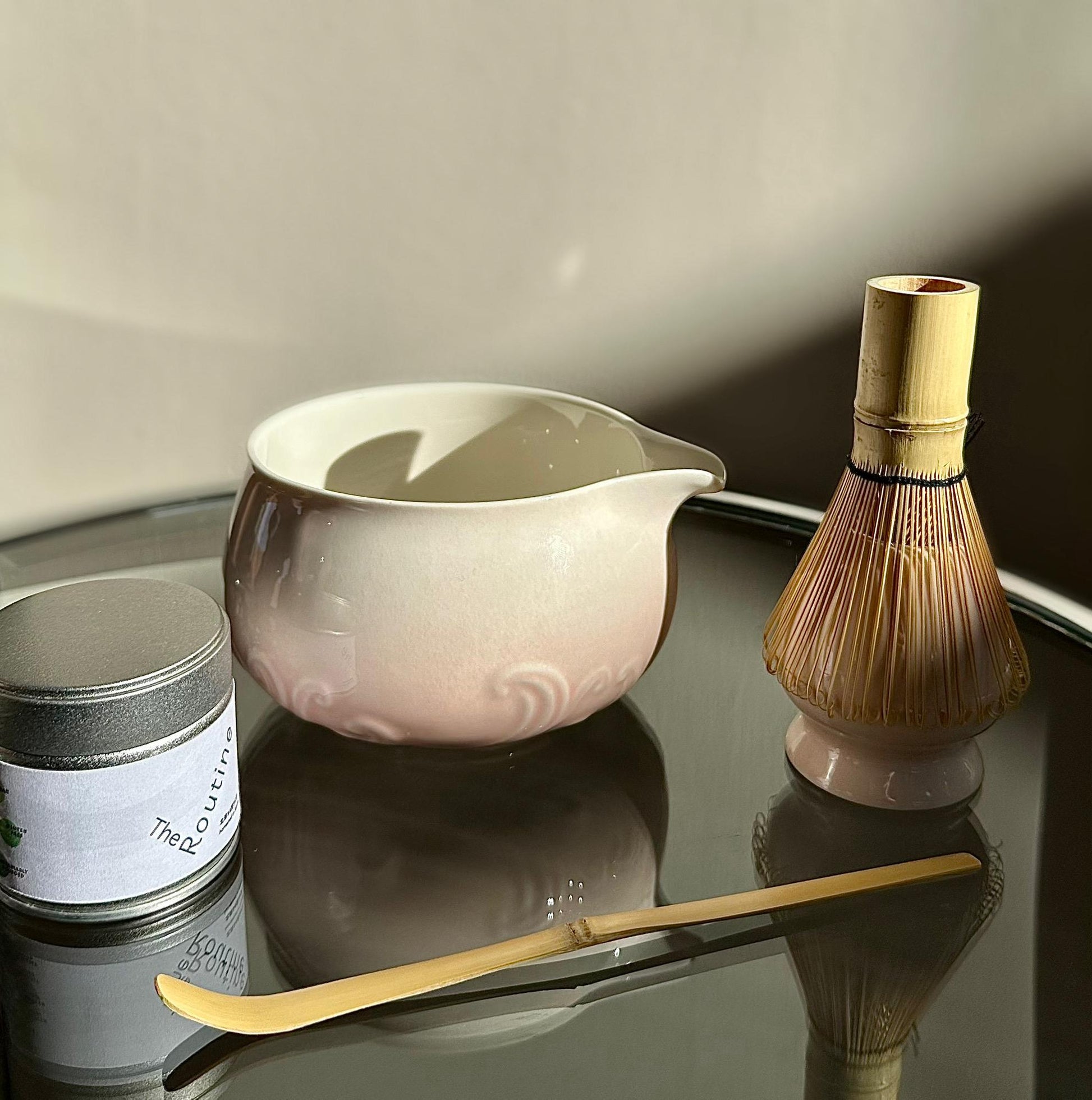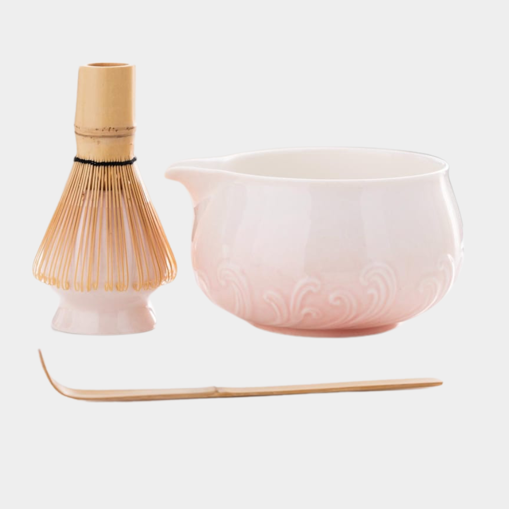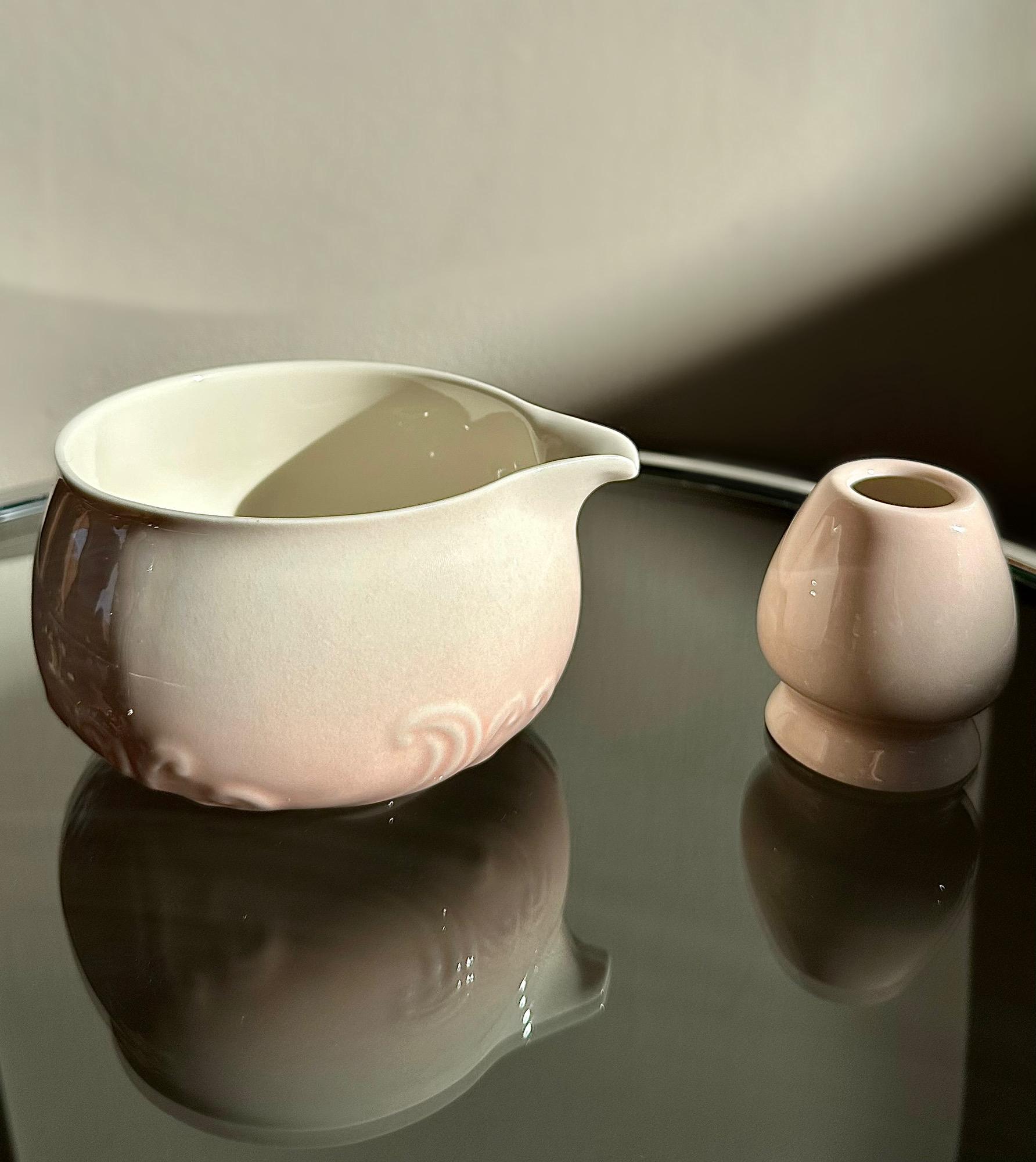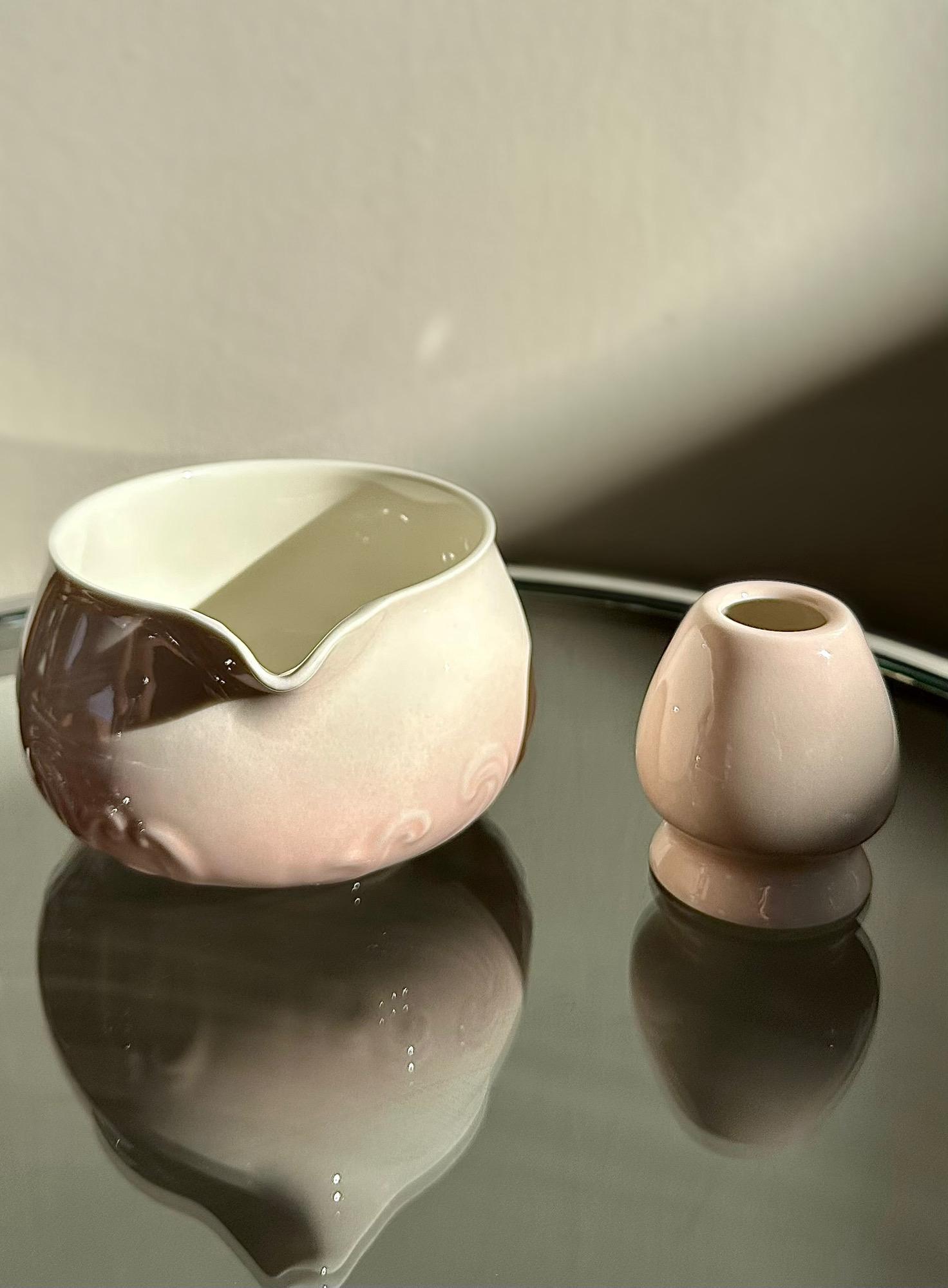 A soft ombré matcha kit in warm blush tones, designed to add a subtle, romantic touch to your kitchen. This glaze pairs effortlessly with neutral palettes, light woods, and soft-toned cookware.